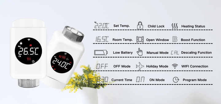 The TRV01-ZB WIFI home thermostat offers enhanced wireless convenience with its battery-powered operation and wifi connection. Additionally, its automatic cleaning feature, which activates every Monday, ensures that the valve pipes remain clean and free from debris. This thermostat supports multiple functions, such as ON/OFF mode, frost protection, and a boost function to safeguard the valve. Furthermore, the device includes a key lock mechanism that effectively prevents accidental adjustments and low battery warning to inform you of the thermostat using status.