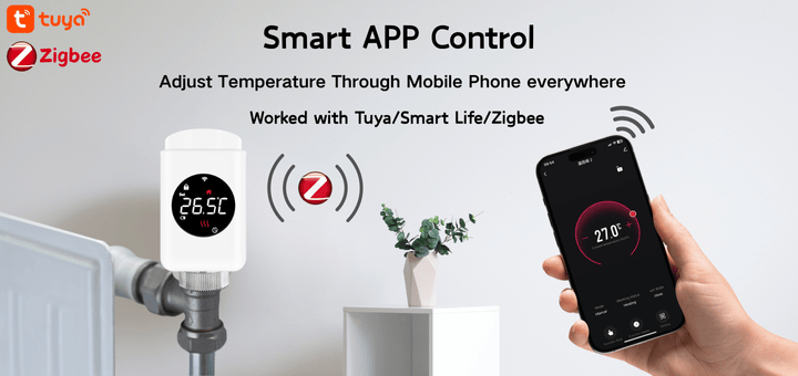 By connecting to WiFi and the Zigbee smart gateway, you can use mobiles phone with Tuya/Smart Life to monitor and adjust working ststus of this wireless TRV01-ZB thermostat.