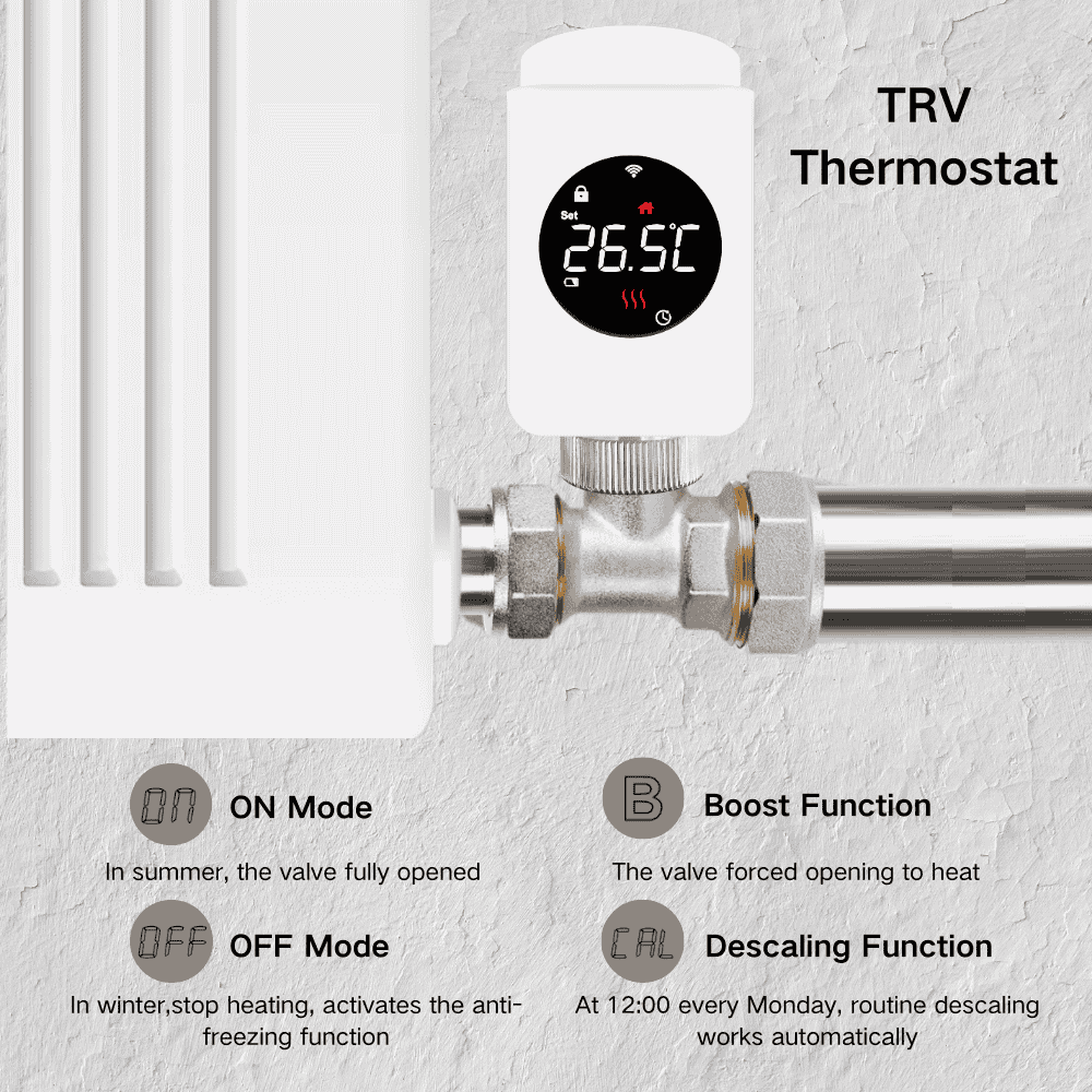 The TRV01-ZB WIFI home thermostat offers enhanced wireless convenience with its battery-powered operation and wifi connection. Additionally, its automatic cleaning feature, which activates every Monday, ensures that the valve pipes remain clean and free from debris. This thermostat supports multiple functions, such as ON/OFF mode, frost protection, and a boost function to safeguard the valve. Furthermore, the device includes a key lock mechanism that effectively prevents accidental adjustments and low battery warning to inform you of the thermostat using status.