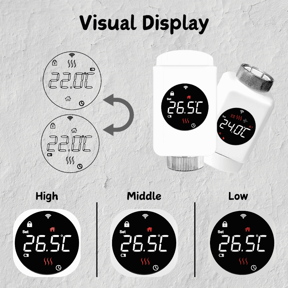 By connecting to WiFi and the Zigbee smart gateway, you can use mobiles phone with Tuya/Smart Life to monitor and adjust working ststus of this wireless TRV01-ZB thermostat.
