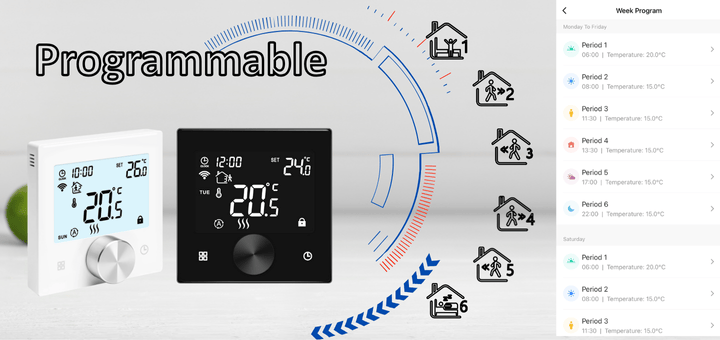 With a fully customizable 5+1+1 days programmable schedule, it helps you optimize energy use without compromising comfort, making it an ideal choice for energy-conscious households looking to upgrade their climate control with style and intelligence.