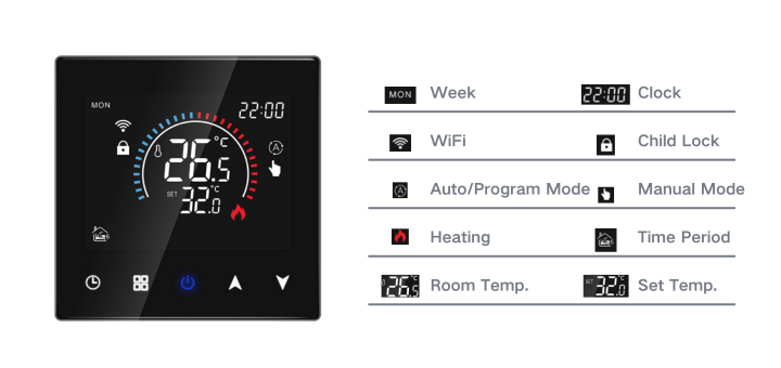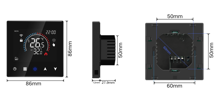 V03H wifi thermostat is a wall-mounted heating temperature controller with a compact size to save space and modern design to match different application places such as homes, offices, schools, factories, apartments, hotels etc.