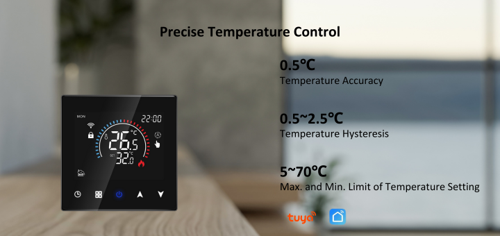 V03H wifi thermostat is a wall-mounted heating temperature controller with a compact size to save space and modern design to match different application places such as homes, offices, schools, factories, apartments, hotels etc. The smart electric underfloor heating thermostat features a sleek LCD color display with dual temperature display for easy monitoring. With touch buttons for simple operation and a classic white/black color scheme, it fits perfectly in modern homes. Enjoy 0.5℃ high accuracy control, WiFi remote control via app, and 6 programmable periods a day. The power-off memory function ensures your settings are safely saved for ultimate convenience and comfort.