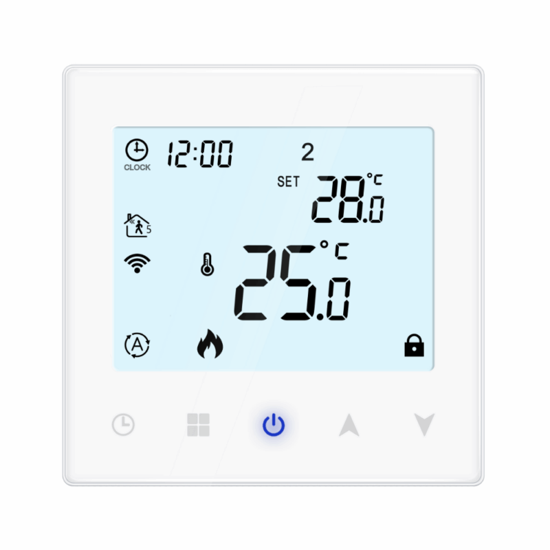 V03H wifi thermostat is a wall-mounted heating temperature controller with a compact size to save space and modern design to match different application places such as homes, offices, schools, factories, apartments, hotels etc. The smart electric underfloor heating thermostat features a sleek LCD color display with dual temperature display for easy monitoring. With touch buttons for simple operation and a classic white/black color scheme, it fits perfectly in modern homes. Enjoy 0.5℃ high accuracy control, WiFi remote control via app, and 6 programmable periods a day. The power-off memory function ensures your settings are safely saved for ultimate convenience and comfort.