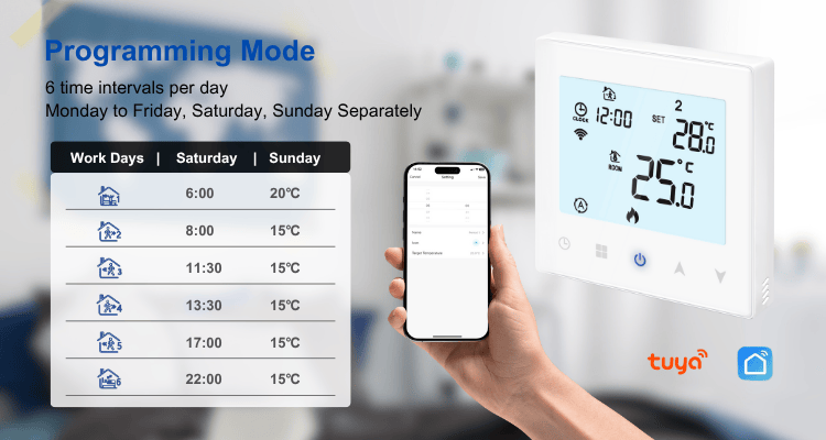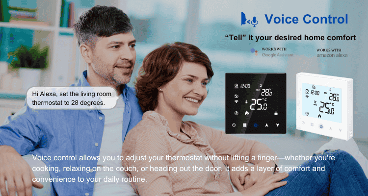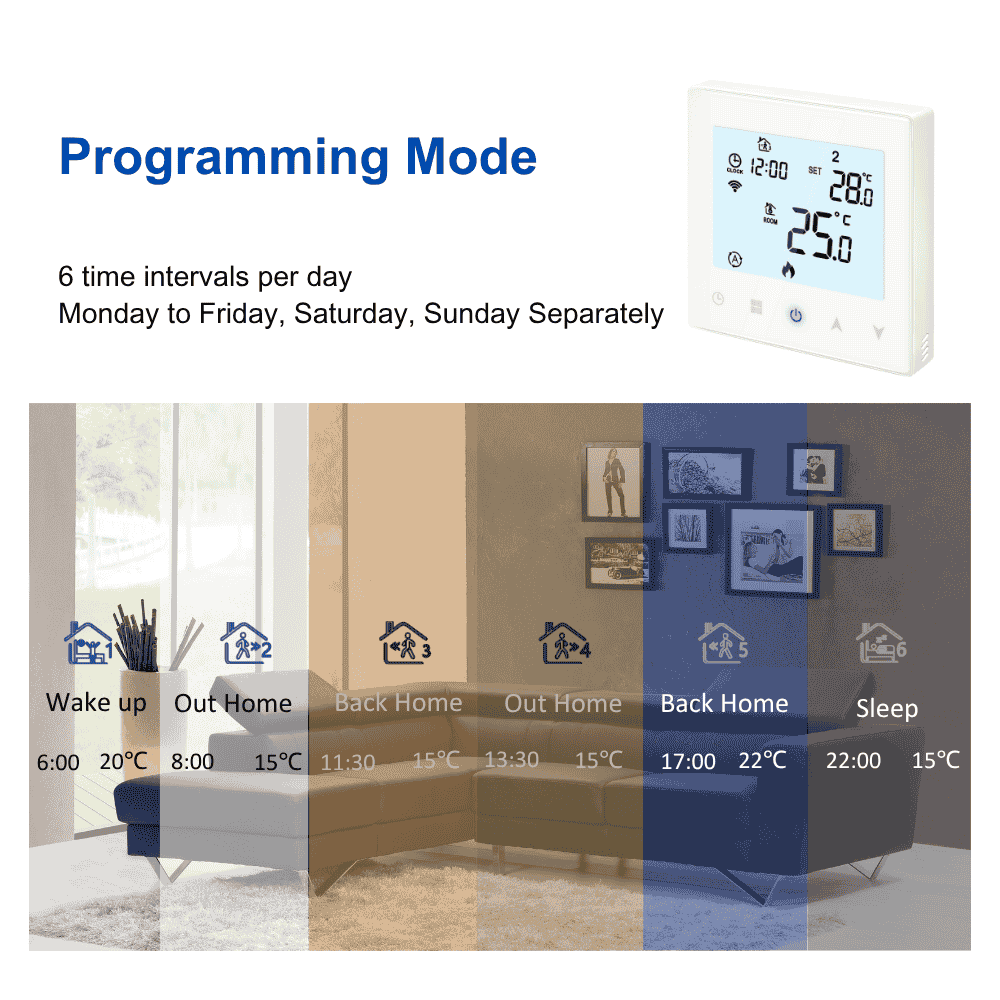 This VT01H smart electric heating thermostat offers precise temperature control for electric underfloor heating, heating cables, or electric radiators. Featuring a sleek touch panel and a modern minimalist design, it blends seamlessly into any interior. Equipped with WiFi connectivity, it allows users to control heating remotely via smartphone, and is compatible with voice assistants like Amazon Alexa and Google Assistant for hands-free convenience. Built-in programmable schedules help reduce electricity consumption while maintaining comfort. Ideal for both residential and commercial electric heating systems.
